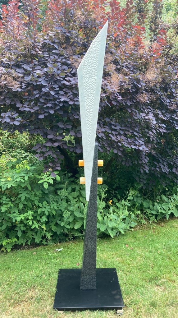 “Slice” Marble, black granite, honeycomb onyx “pins”, on painted steel. Private collection. Height: 6 feet.